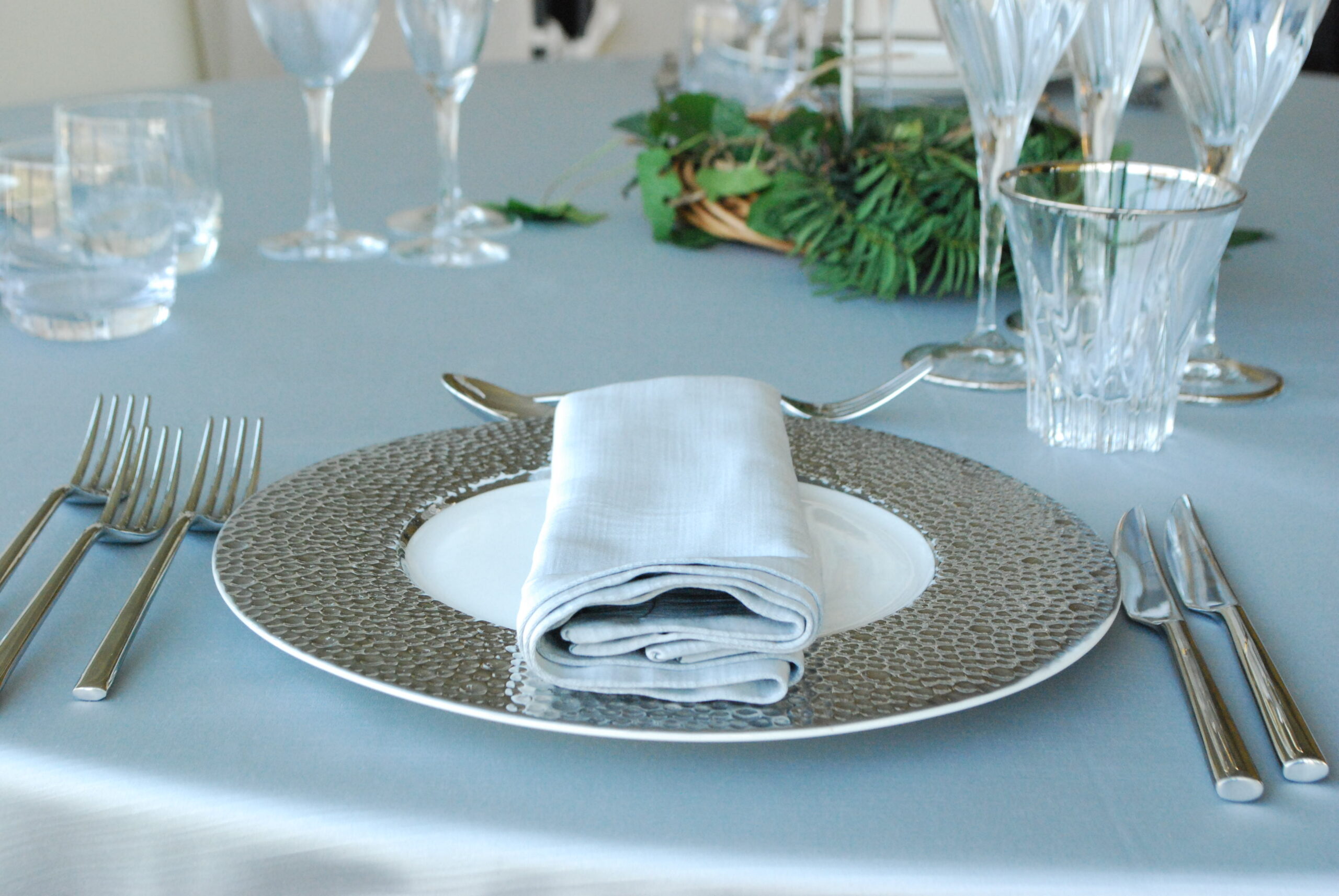 SOT018 Sottopiatto in porcellana bianca con bordo martellato color argento ø 30 cm